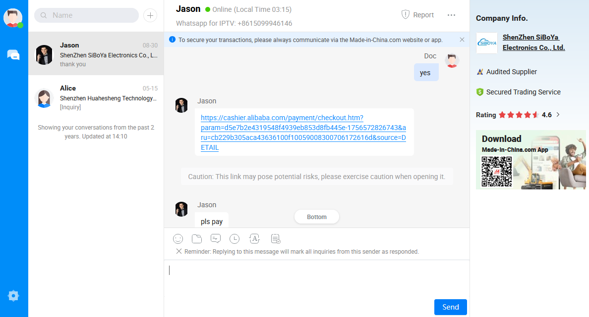 He asks for my email address that is tied to my alibaba account this is where I will pay. He also provides a link that takes me to checkout page. Yes you need an alibaba acct and its free to get one.