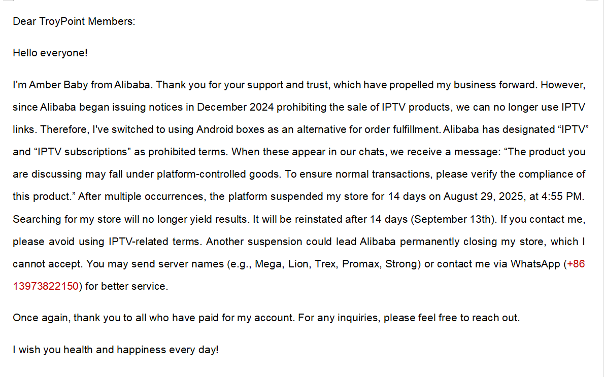 In the chat ask Amber Baby for Strong 8K. Do not mention the word IPTV in any communication through the ali website. She will also provide you with a trial if you want to test before buying.