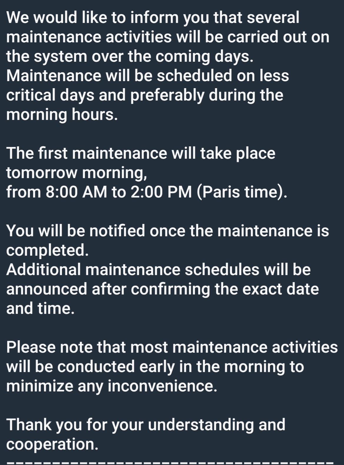 Strong will be fine now, but will go down Friday at 8am Paris time. They are 6 hours ahead of us so that will be 2am Eastern time zone here so depending on when itās back up we may not notice it Friday.