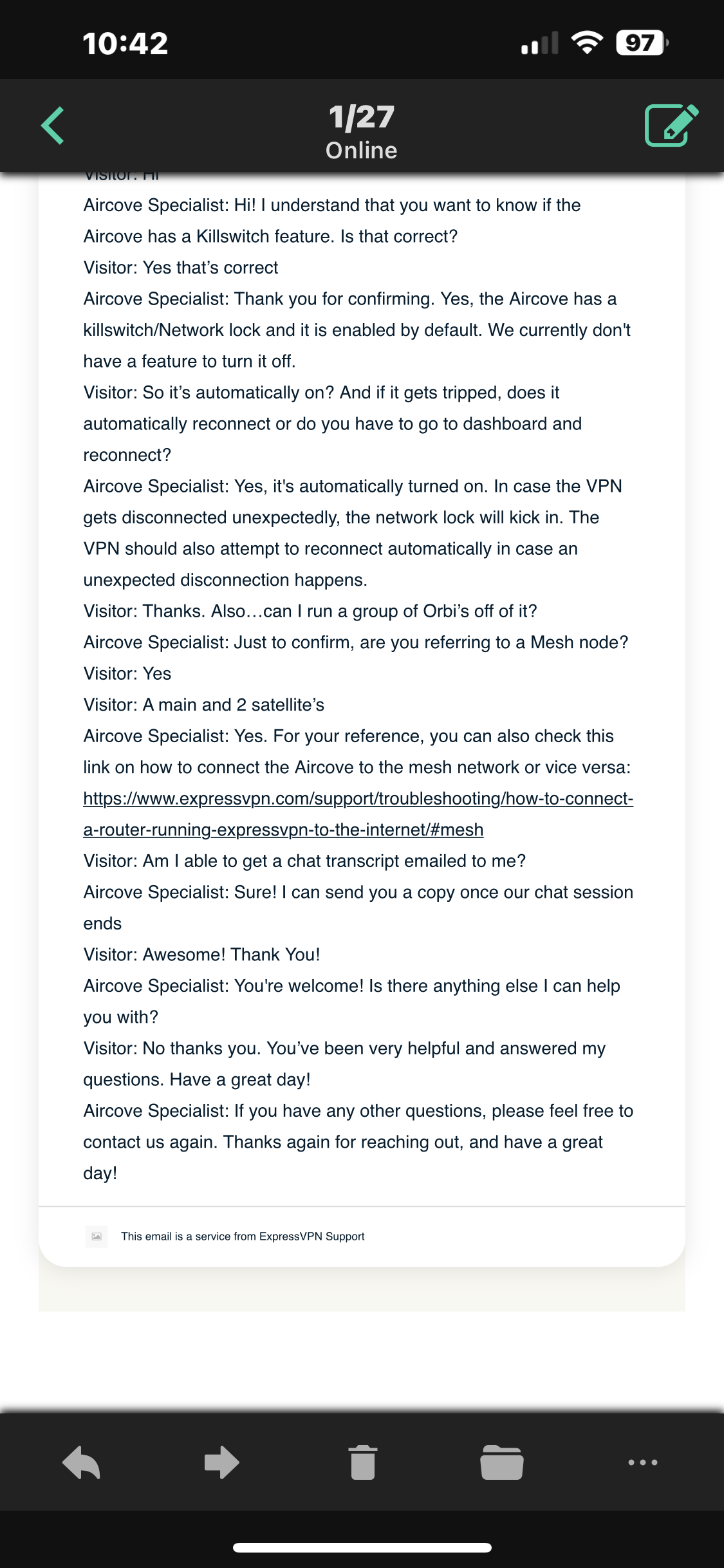 I did reach out to Express CS as I have two accounts with them and the Aircove would eliminate one of them. I also use SS, which my issue still hasn’t been resolved so I put Express on all of them including ones outside my house because they too are getting the SS “Different VPN Detected” and SS was the only one I installed for them. Anyway, I asked about the Aircove Kill Switch as well as running Orbi’s off of it and I’m going to add the screenshot of the chat transcript…