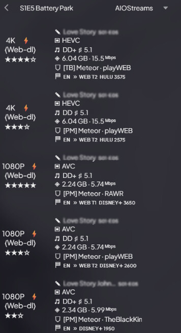 I just tested this with a new show I’m watching. Last week’s episode only has one or two cached 4K stream, and all the rest are 1080P and lower. Here’s a screenshot of my initial list of prioritized streams, prior to any filtering changes: