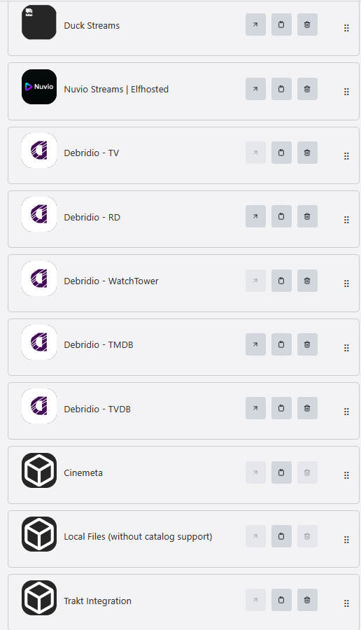 Since you already have AIOstreams setup you don’t need Duck Streams. You may want to modify your addons though. I’m using Torbox (You need Torbox Debrid service to use this addon), Debrido (paid yearly subscription-$10) and Strem Thru Torz. Getting solid links. Got rid of Torrentio since they have a lot of issues. See my previous post in this thread how modify existing setup. Instead of selecting Duck Streams you select AioStreams addon.