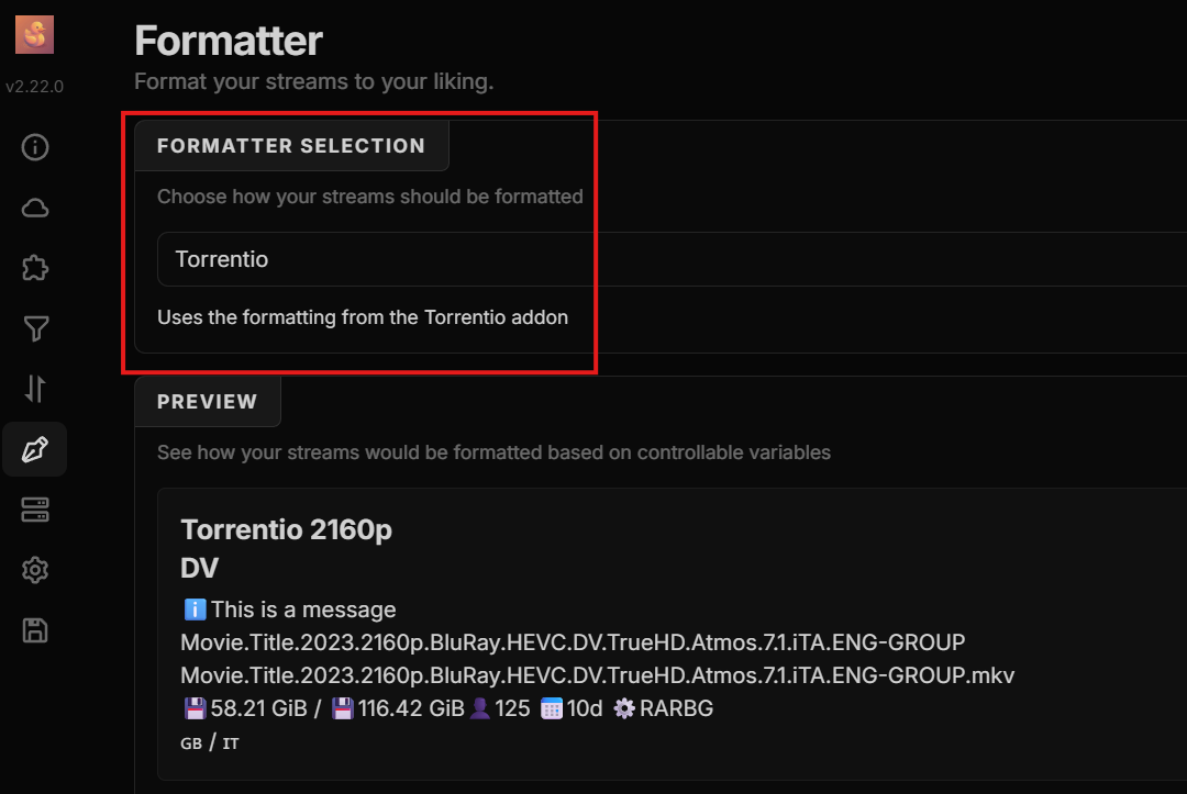So it was pretty simple to get the details of the videos like Torrentio displays. Just set the Formatter Selection to Torrentio lol. Just tested and it worked for me.