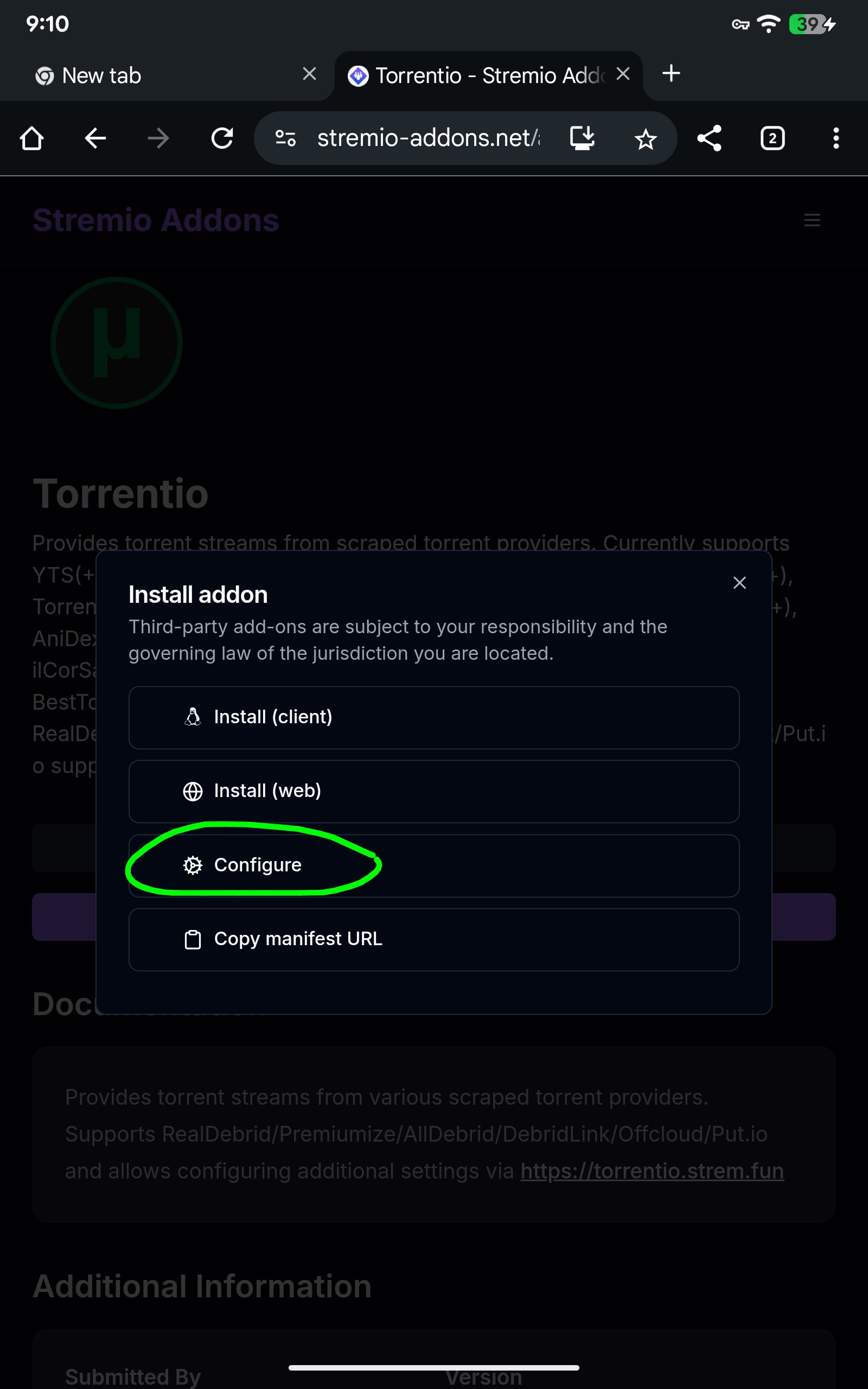 Once you are in the addons site : Torrentio - Stremio Addons. Then hit install then configure.