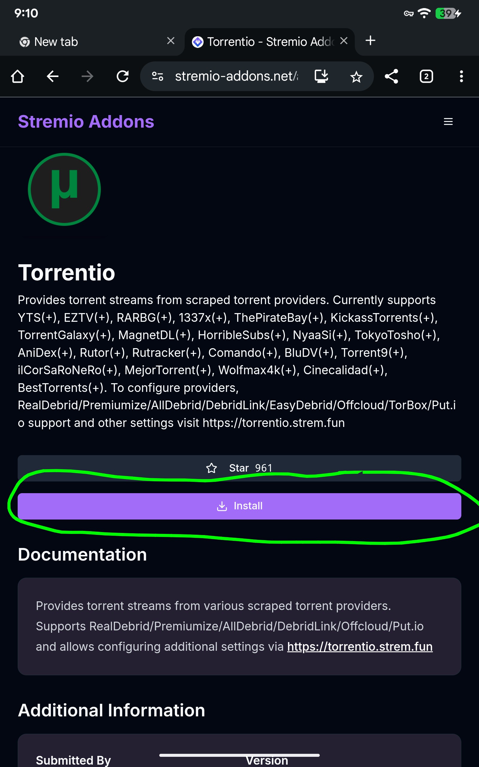Then hit the install button. Now you must be on say your laptop or tab with Stremio installed. Then make sure to force close Stremio, clear cache. Then on your streaming device. Force close Stremio, clear cache. Then open stremio again and you should be linked up and see the TorrentioRD addon in your addons listings.