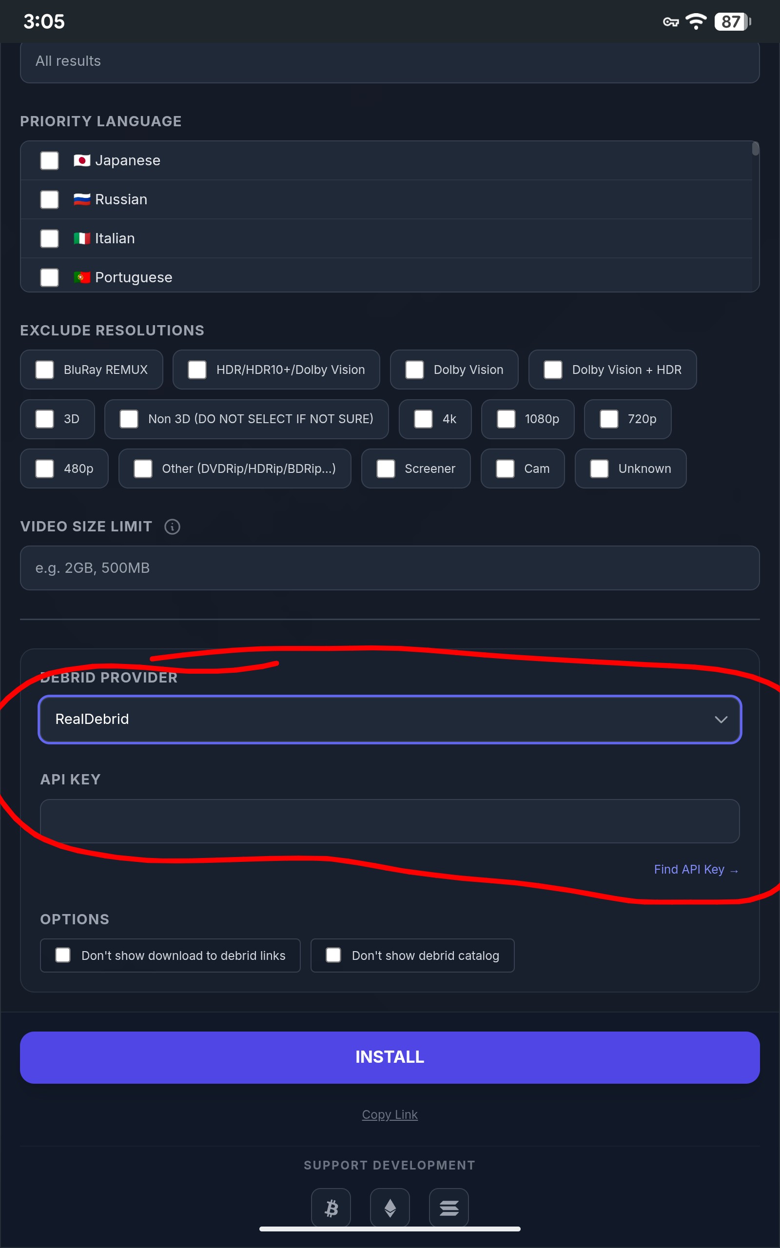 You install the key. Copy the key then paste it in the line that says API Key. Once the rest of the addon is configured to your liking simply click the Huge white INSTALL button. Also just to clarify, you don’t generate a key, that is your Real Debrid API key for all addons you are using, in any app, that you add Real Debrid to, and it’s in your Real Debrid panel.