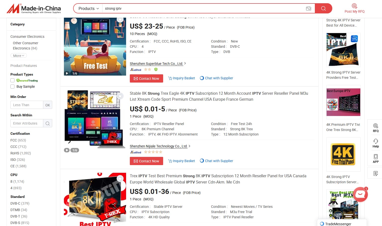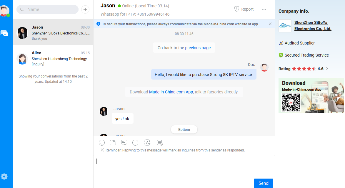 She can be contacted through whatsapp, Telegram, or signal. I don’t use any of those. If you end up buying her services you are going to need an Alibaba account to make payment. I suggest going to Alibaba and creating an account if you don’t have one. Then simply go to her page below, message her and ask for a trial of her Strong 8K IPTV service. She will send you your log in credentials. Then if you want to purchase the service she will send you payment info in a DM through Alibaba. I have the Strong 8K service as a backup to my main service. It is very good and costs $32/year. Here is a link to Amber’s Alibaba page