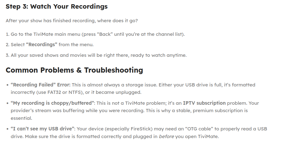 If push comes shove, you can try using the Sparkle TV player instead of Tivimate. Sparkle is better at recording than Tivimate and the developer is very active in improving the app.