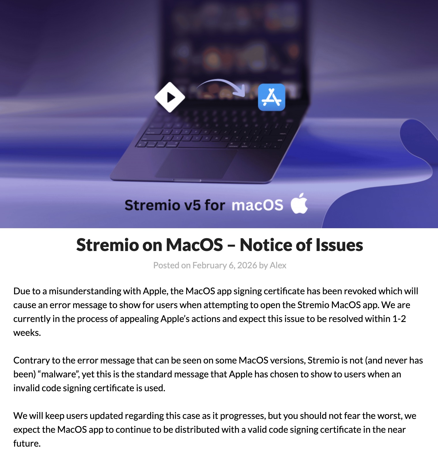 warning, +plus immediate deletion here today… reinstalled from trash, and same result. no longer available in the app store. however, stremio still working fine on my ipad….