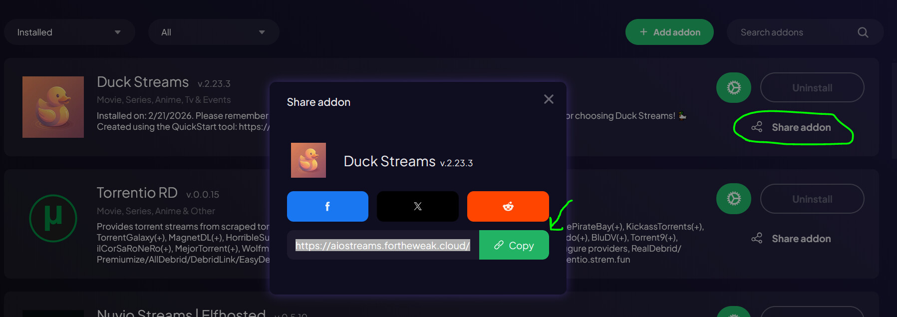 Go to the Addons section of the app (or in the STRMR Web Dashboard), and paste in your install URL (.json code) for Duck Streams, Torrentio, etcā¦