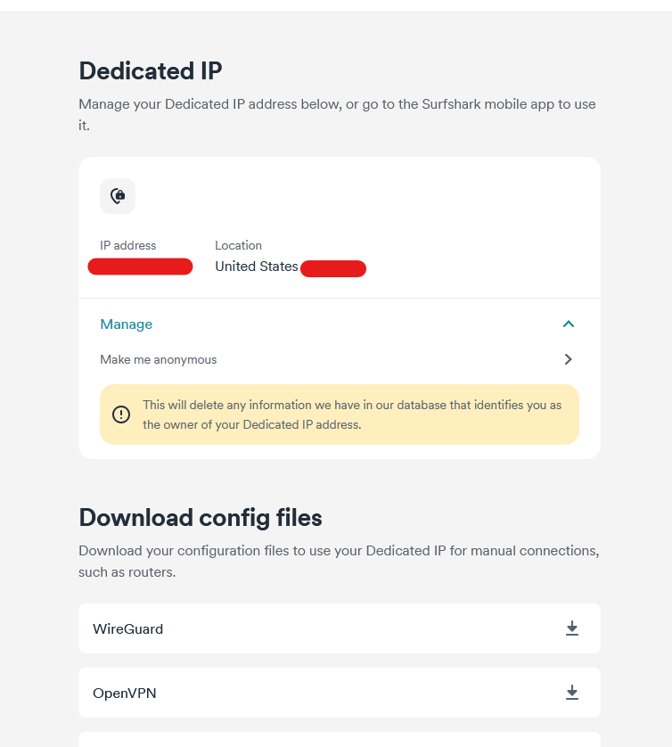 Sorry, meant config files. See my images below which shows what happens after purchasing a dedicated IP Address. You have the ability to anonymize it.