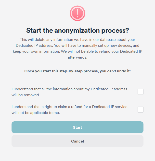 This will delete any information we have in our database that identifies you as the owner of your Dedicated IP address.